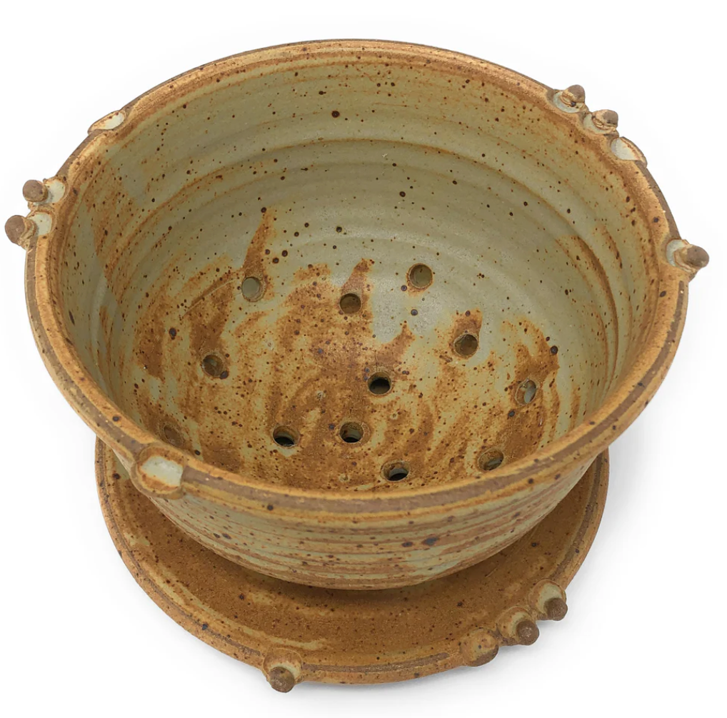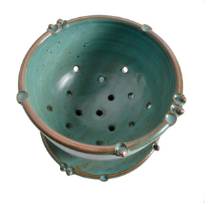 Small colander for berry processing with saucer. Non-lead glaze. Dishwasher safe.
