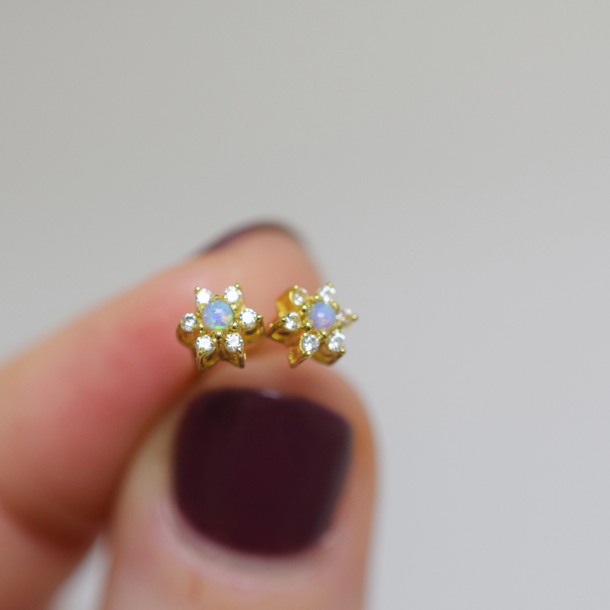 These dazzling blue opal and diamond studs make for a small yet sparkly pop of color and are the perfect compliment to an evening look.