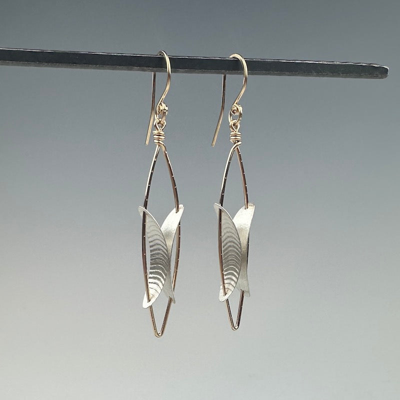 Sterling silver, 14k gold fill. 3/8" across at widest and just over 2 1/2" tall including hand-sculpted gold fill wear wires.