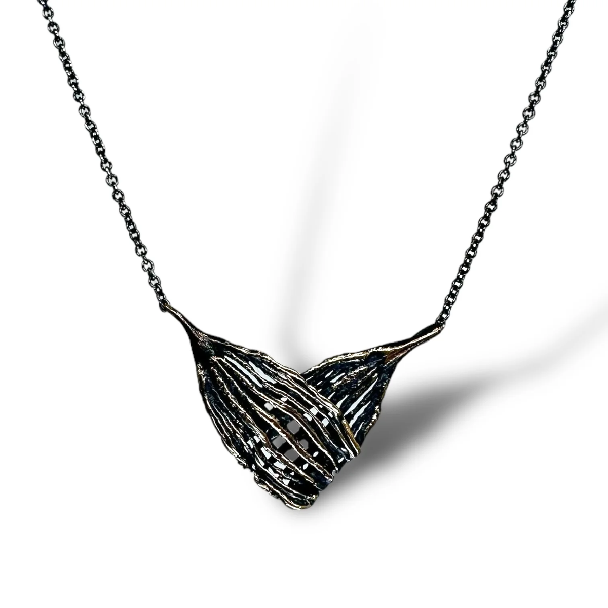 Carved bracts of a pinion pinecone layer and kiss to form a heart-shaped pendant.