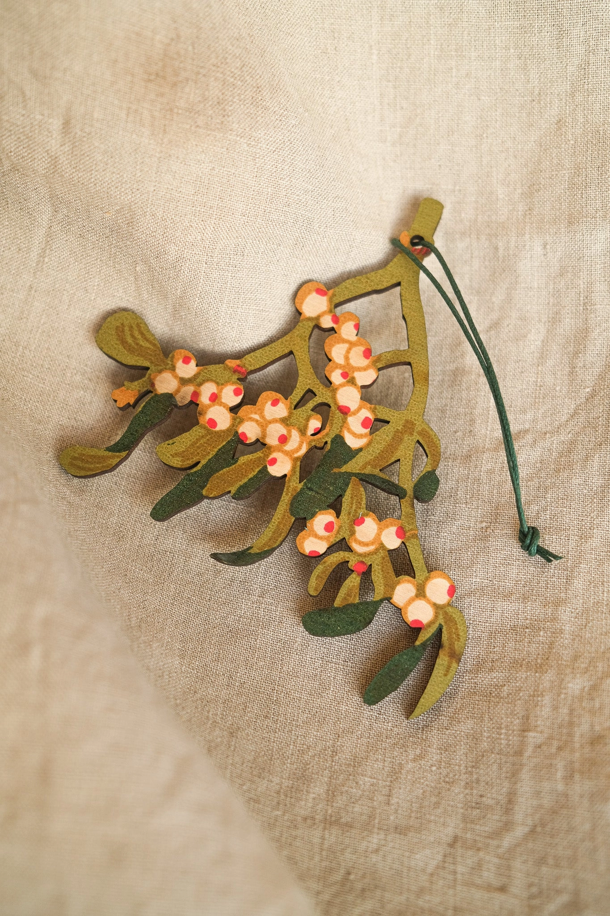 This unique ornament features a classic mistletoe motif, adding a festive touch to any Christmas tree or doorway.