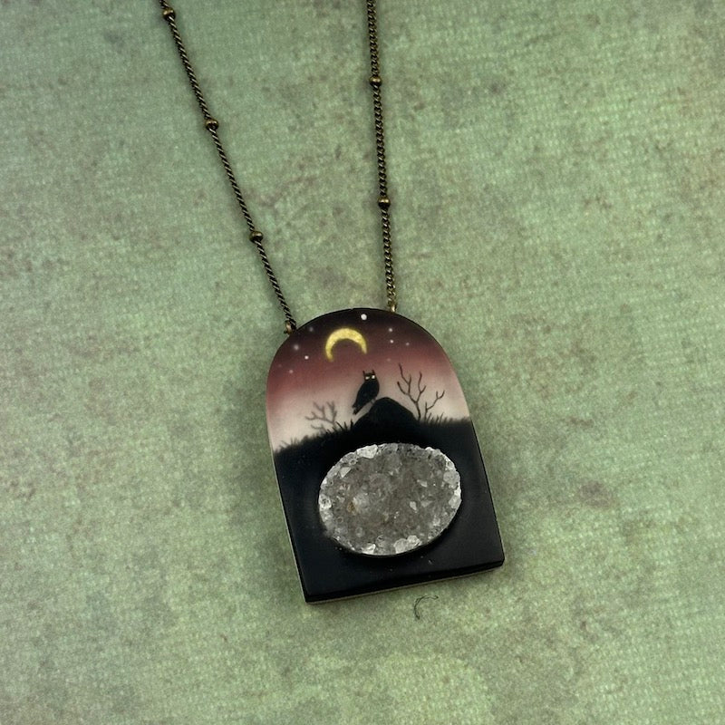 A moody dusky landscape bears the silhouette of an owl, perched above the unique texture and sparkle of an oval slice of geode.