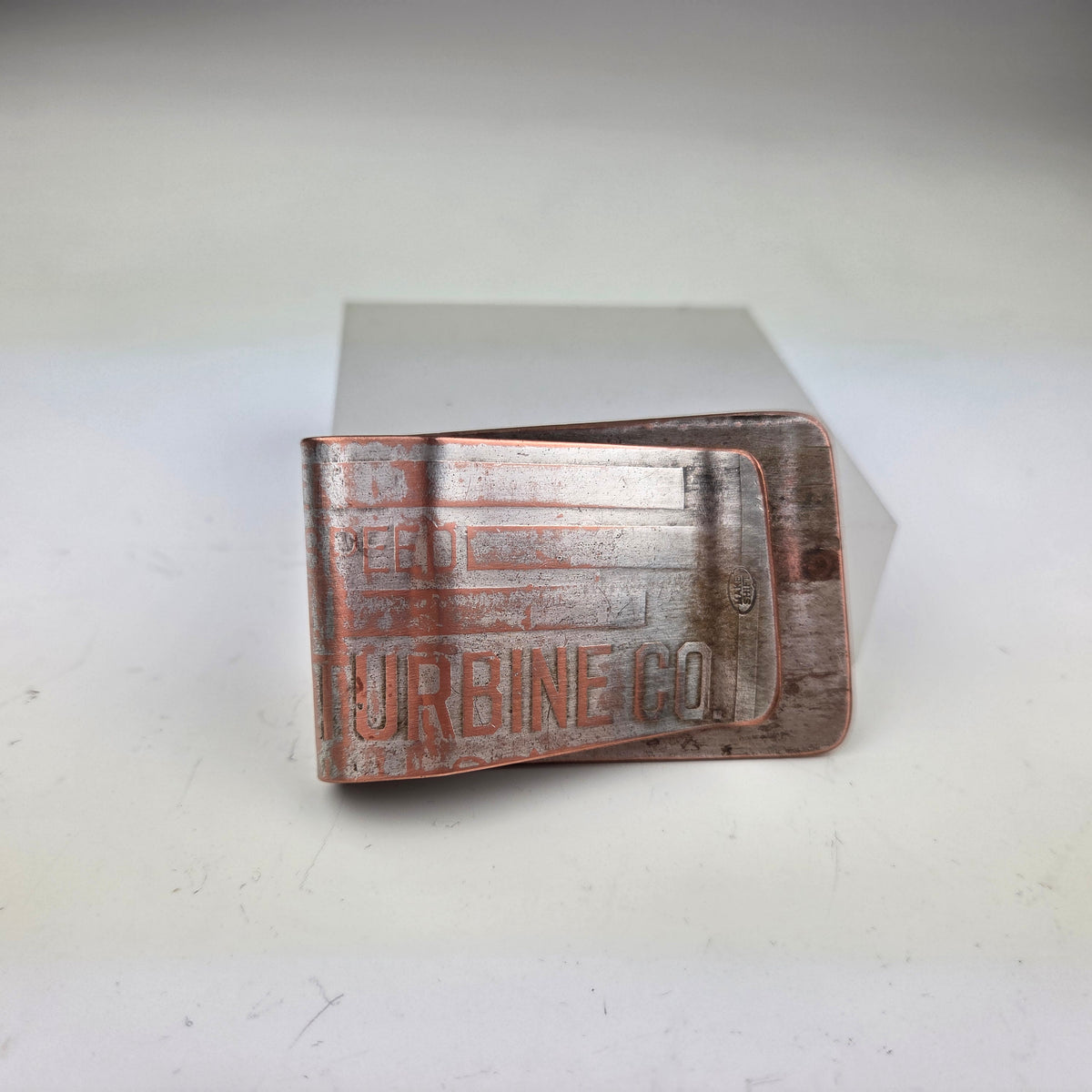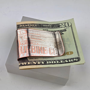 A piece of history, a part of a machine refashioned in to a rugged money clip. This piece of reclaimed plated copper is from a De Laval Steam Turbine from Trenton, NJ.