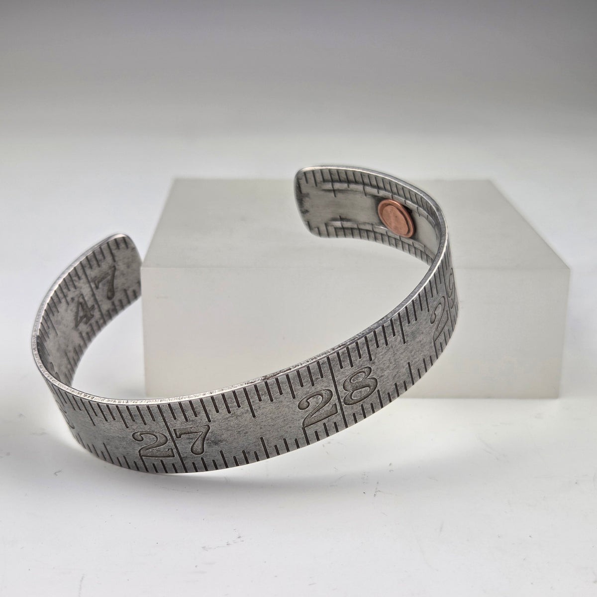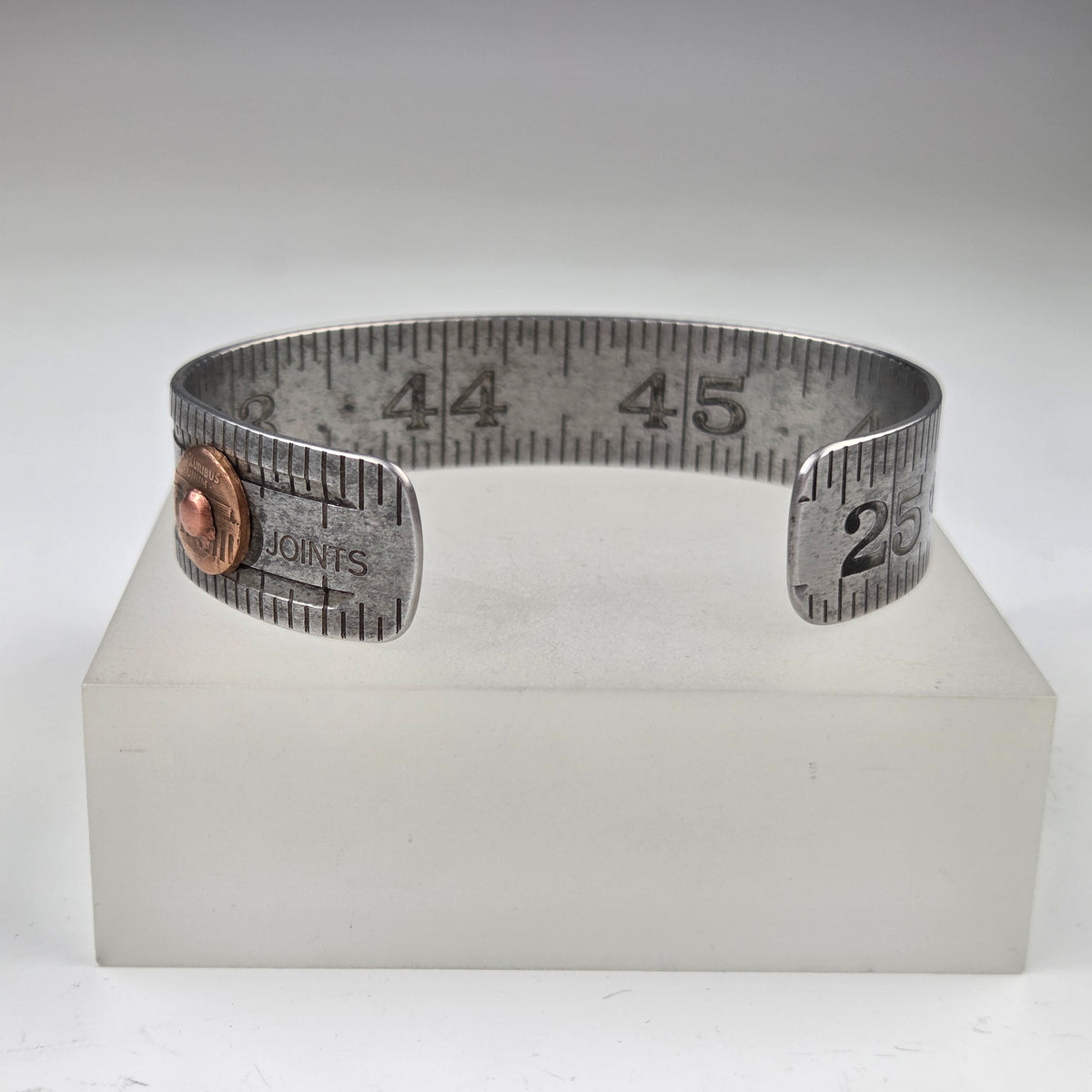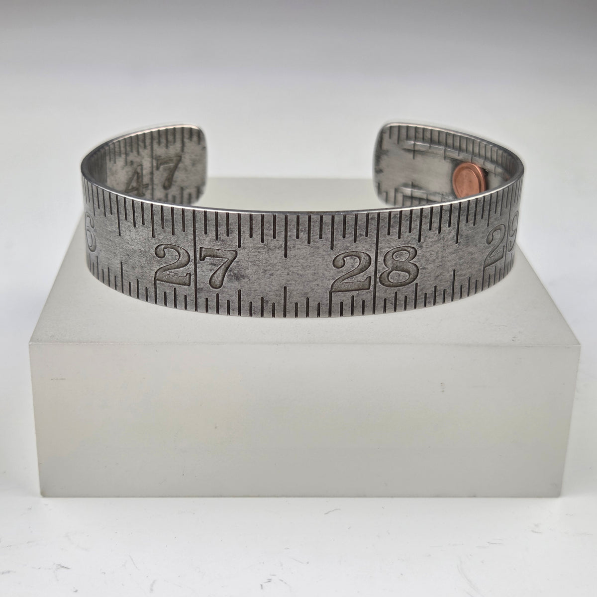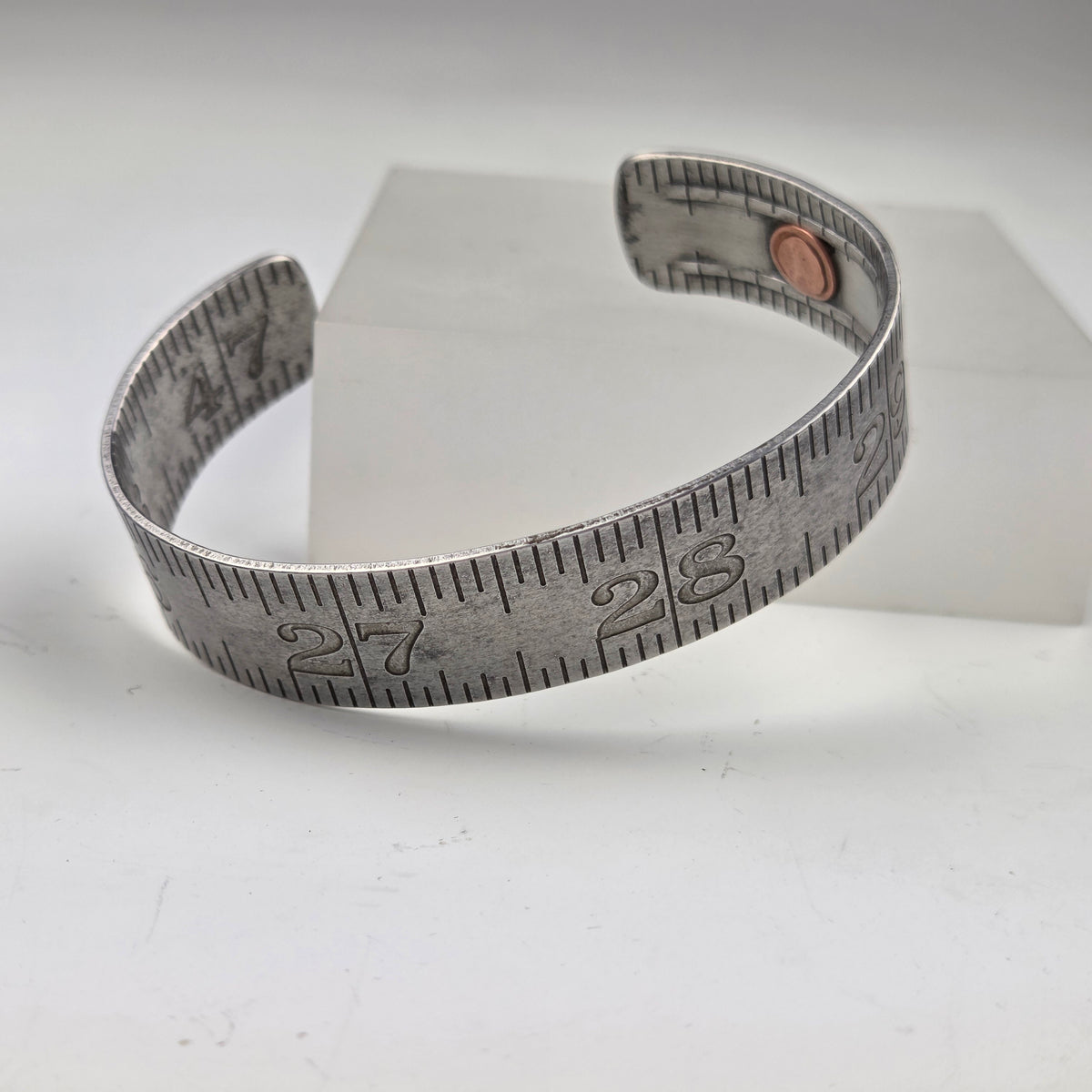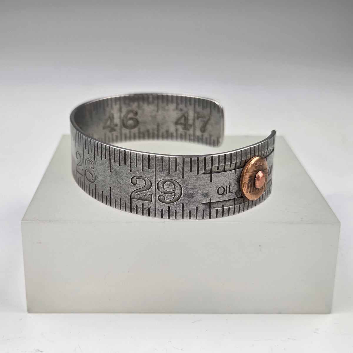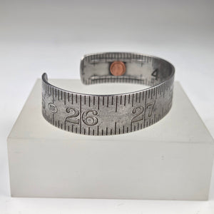 Vintage folding rulers repurposed into a cuff bracelet with industrial flair. A copper rivet adorns one end. You will receive the exact cuff pictured, displaying numbers 25 through 29.