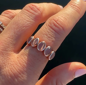 This ring features a lab-created pink cats eye moonstone set in rose gold vermeil, selected for its soft color and subtle shimmer. The smooth, reflective surface gives a quiet visual detail that’s easy to wear without feeling fussy.