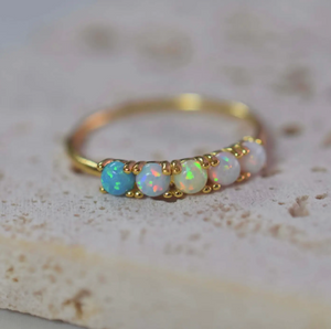 A dainty and easy to stack/layer band with an ombre color way of beautiful pastel opals.