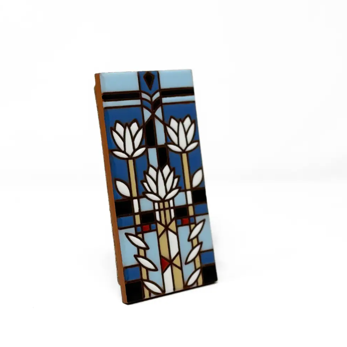 3"x6" Ceramic Tile design inspired by the art of Frank Lloyd Wright. Each tile is cork-backed to prevent scratching, and a convenient hanging hole makes it easy to display on any wall. Hand-glazed by skilled Tucson artists in small batches, this piece is crafted to be naturally fade-proof and durable, so it will stand the test of time.