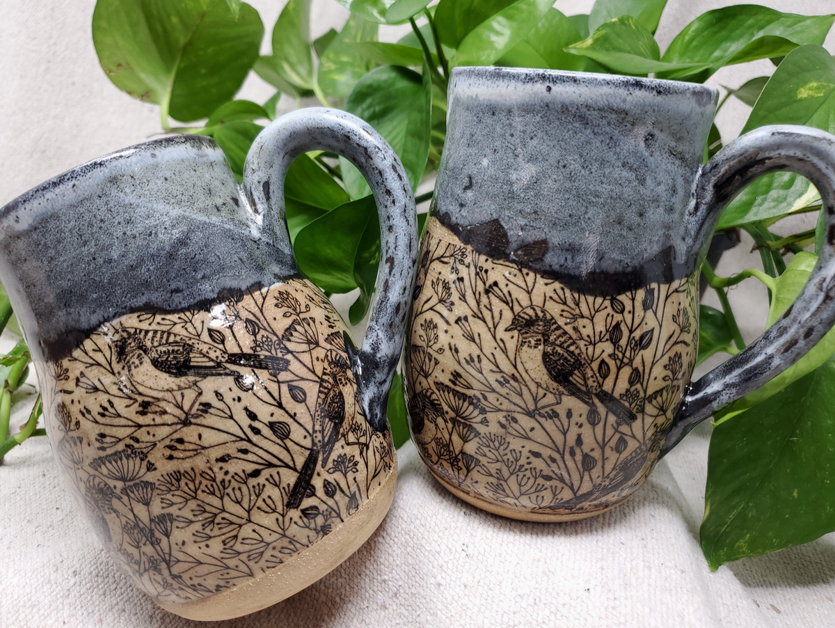 Handmade/wheel-thrown ceramic coffee mug designed with a black birds & branches print, in a black glaze with greyish blue hue overlay.