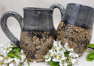 Handmade/wheel-thrown ceramic mug with a varying black print flower pattern in a black glaze with a greyish blue hue overlay.