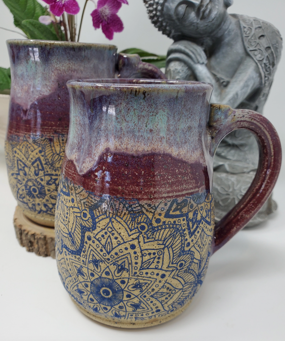 A great way to start a your day with 16 oz. of Zen; wheel-thrown/handmade ceramic mug with a blue Mandala print, with hues of sea foam, purple and grey at the top and on the handle.