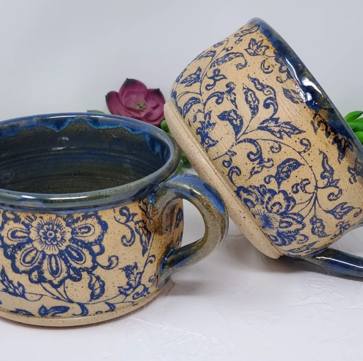 Handmade/wheel-thrown ceramic bowl, with handle. A cobalt blue glaze inside and around the top. A blue floral imprint with natural clay on the bottom.