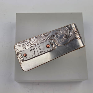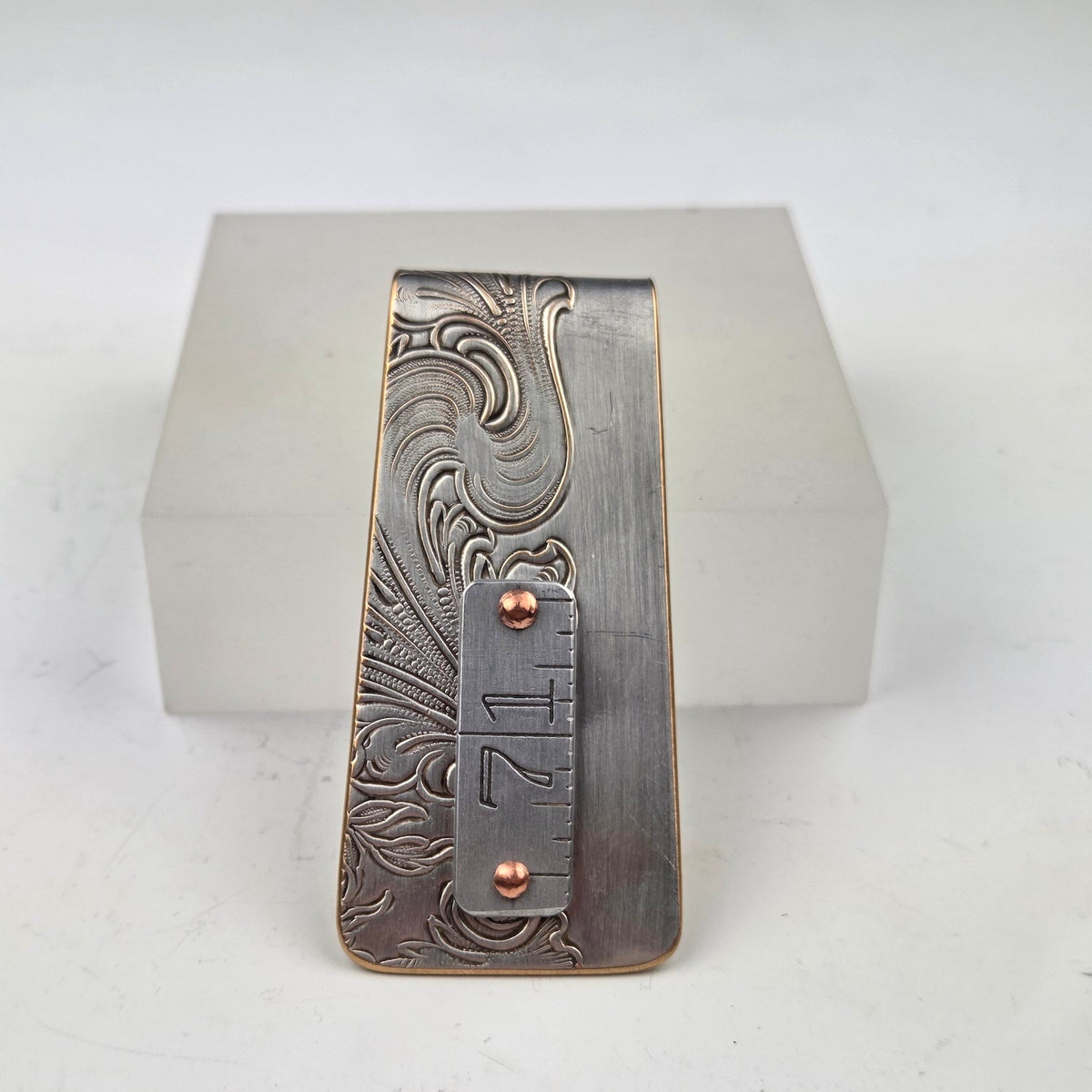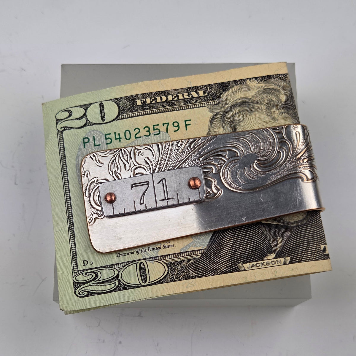 The numbers on these money clips are derived from sections of old rulers that have served tradesmen for decades. They have been cut, sanded, and hand-riveted onto strips of reclaimed silver-plate servingware, making a very durable, functional piece. You will receive the exact clip shown, with a beautifully distressed swirl texture, bearing the number 71.