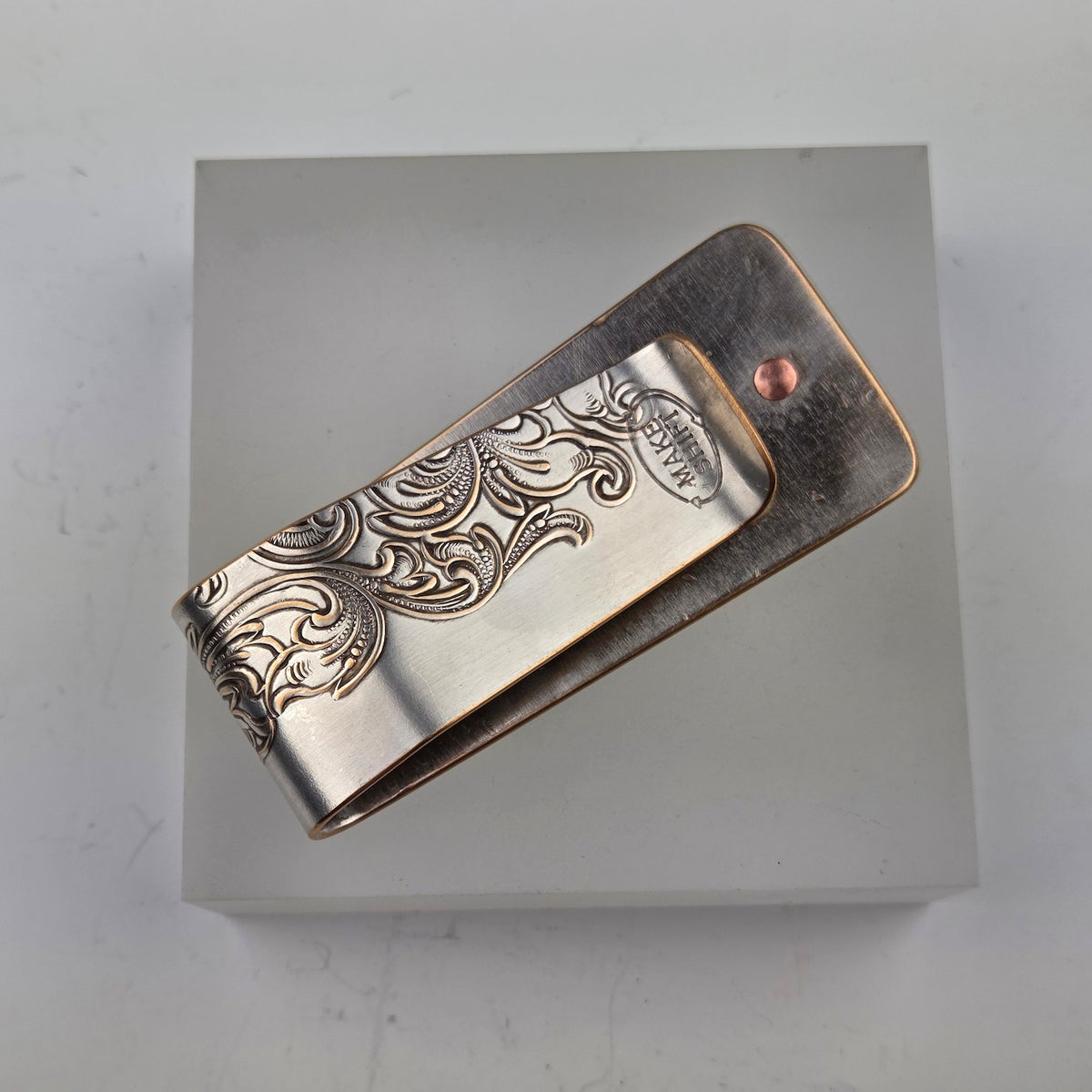 Makeshift money clips can be adjusted to securely hold your preferred thickness of bills, cards, or a combination of both. Artist's instructions for adjustment are included with your purchase.