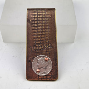 This money clip is adorned with a 1944 U.S. Liberty Dime - popularly known as a "Mercury Dime" - minted the same year as the shell was manufactured.