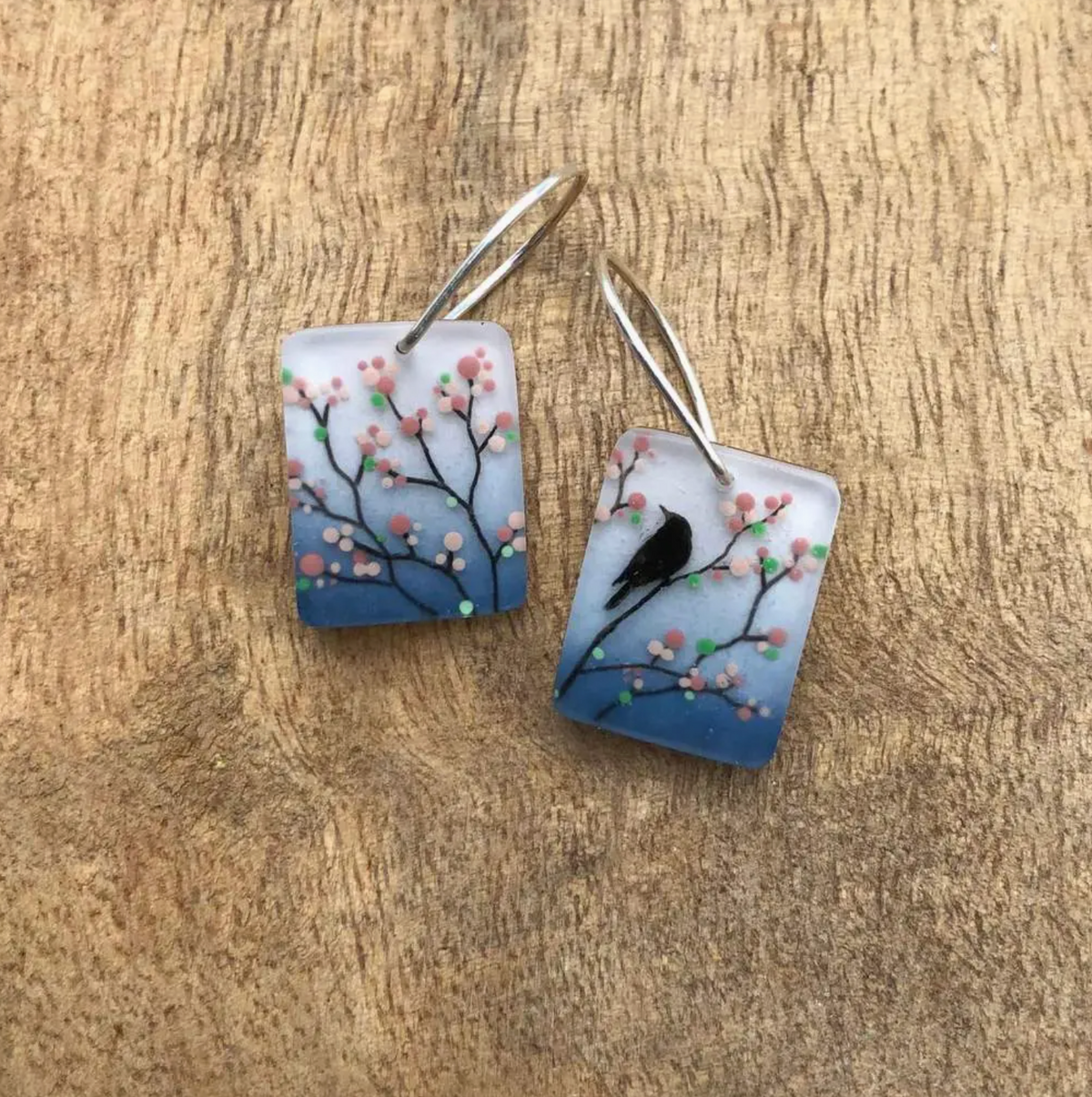 A single bird in silhouette enjoys the colors of spring in this charmingly asymmetrical pair of earrings. The hand-painted design is enclosed in layers of resin, supported by wood.